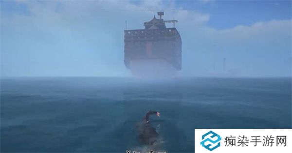 2、接着玩家可以游泳过去那艘船,然后一路爬上船上。