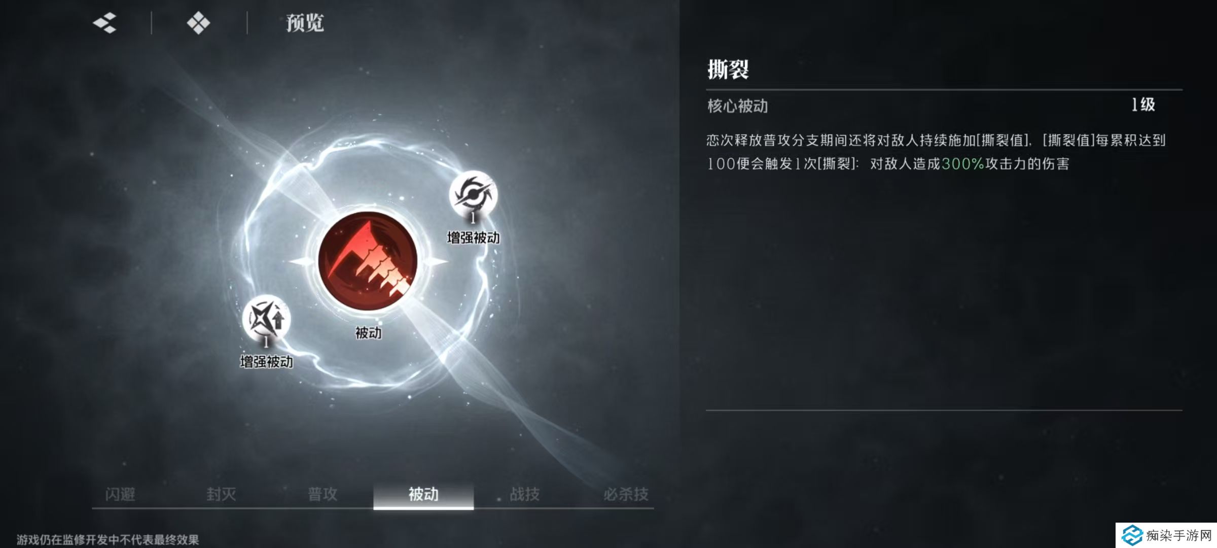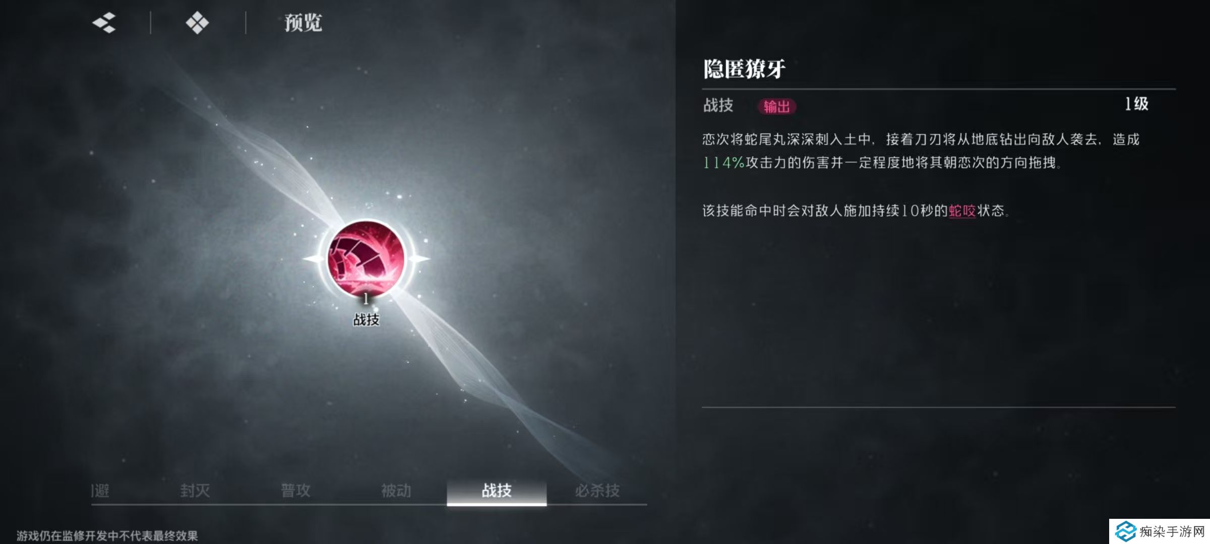 因为是紫色品质,所以只有一个核心被动和两个增强被动。核心被动撕裂,释放普攻分支期间,对敌人施加持续的撕裂值,积累100点撕裂值就可以触发一次撕裂造成伤害。在增强被动的影响下,撕裂造成伤害提升,每次对敌人施加撕裂值速率提升。战记隐匿獠牙,将蛇尾丸刺入土中,刀刃从地底钻出向敌人袭去,造成伤害后将目标朝阿散井恋次方向拖拽。技能命中时会对敌人施加持续十秒的蛇咬状态。