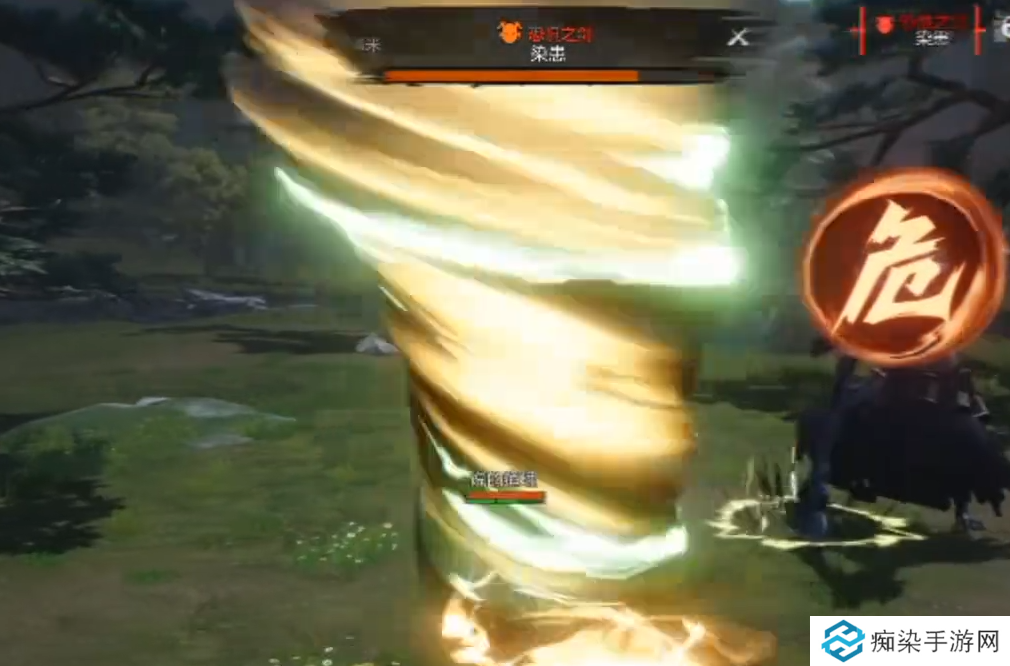 躲开之后周围会出现一道龙卷风,屏幕上面也会出现一个危险的字迹。然后躲开这一个技能之后,他就恢复原来的状态了。然后还会继续的朝前方劈砍,所以我们依旧要灵活地挪移并躲开他的攻击,接着在注意之前的攻击,并将其躲掉,然后不断消耗他的血量就能通关了。