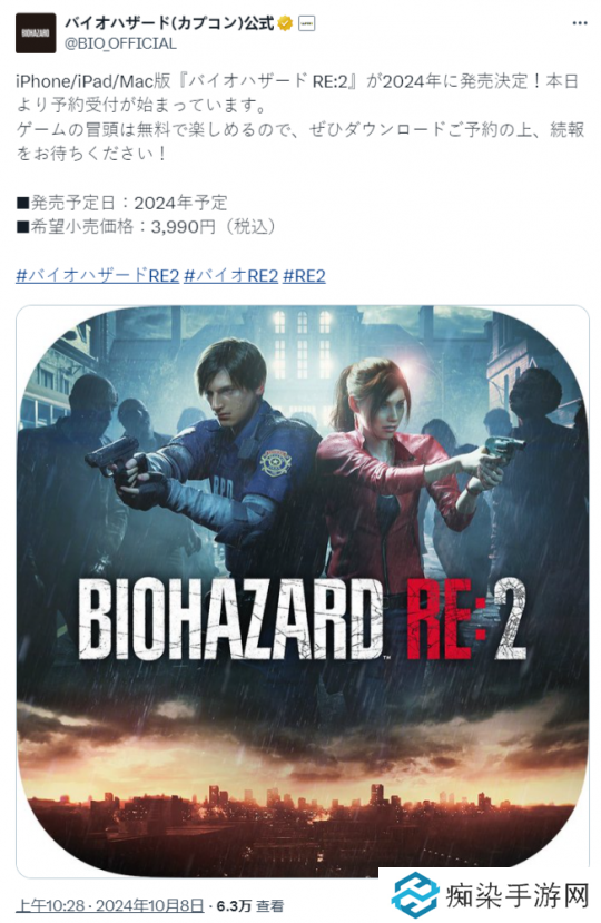 10月8日,卡普空宣布《生化危机2:重制版》将于2024年年内推出iOS和Mac版,售价3990日元(约合人民币190元),即日起开启预购,该作仅可以在iPhone 15 Pro、iPhone 15 Pro Max、iPhone 16或以上版本的iPhone,以及所有配备M1芯片或以上版本的iPad和Mac上游玩,游戏还支持智能分发,使用同一Apple ID购买一份,即可在iPhone、iPad、Mac上通用。