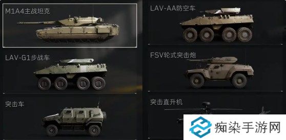 目前可改装的战斗载具共有6种类型。分别是M1A4主战坦克、LAV-G1步战车、突击车、LAV-AA防空车、FSV轮式突击炮、突击直升机。