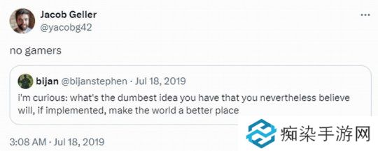 早在几年前,Jacob Geller曾回复过Compulsion Games编剧Bijan Stephen的一条推特。Bijan Stephen表示:“我很好奇,你最愚蠢的想法是什么,但你相信如果付诸实施,会让世界变得更美好”,对于该问题,Jacob Geller简单回复称:“没有游戏玩家”。