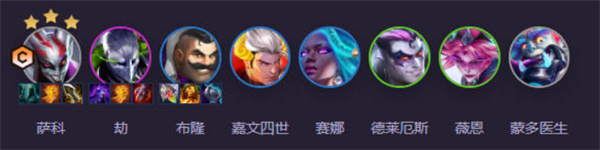 这些英雄的组合能够带来优秀的输出和防御能力,萨科、劫和薇恩作为主要的输出点,而布隆、嘉文和蒙多则提供了足够的防御和控制。