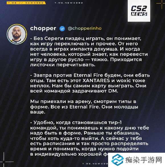 在队伍击败Natus Vincere成功晋级BLAST 赏金赛决赛之后,Spirit战队指挥chopper分享了自己的赛后感受,以及决赛将对阵Eternal Fire的看法。