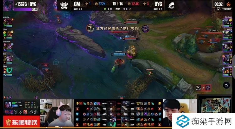 【6:37】GM三人包下越塔强杀Lwx维鲁斯,但是BYG中野支援到位反击成功,换掉了GM下路组,Lwx维鲁斯复活K了个头!同时上路GimGoon贾克斯单杀Gogoing奥恩!