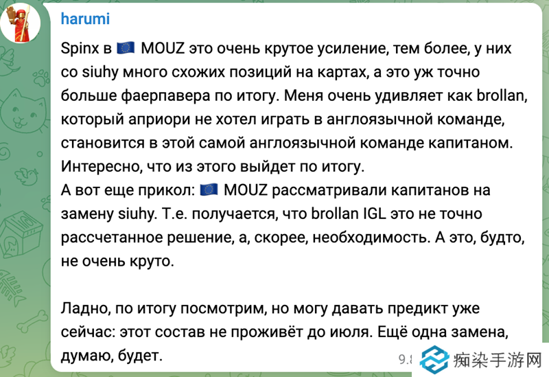 MOUZ宣布下放指挥siuhy并签下Spinx之后,独联体知名爆料人harumi在个人社交媒体账号上分享了自己的看法。认为Brollan担任指挥只是紧急决策,还会有新的指挥人选出现。