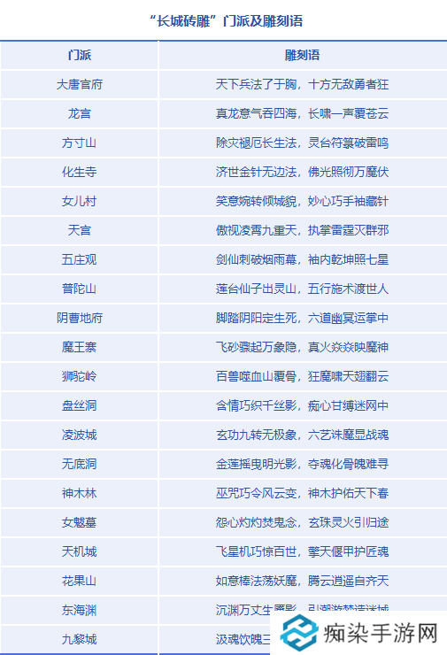 以下为20门派对应雕刻语,活动结束时,【长城守望】新服成就榜前十的少侠均可获得一份!