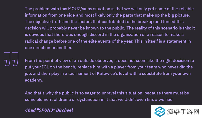 “MOUZ战队与siuhy这一事件的问题在于,我们很可能只能从一方获取部分可靠信息,而且大概率只是拼凑出大致情况的部分信息。客观事实以及导致分道扬镳并迫使做出这一决定的因素,公众可能永远不得而知。实际情况是:显然,在战队内部存在足够多的矛盾,在年度精英赛事之一前做出如此激进的改变。这本身就说明了一些问题。