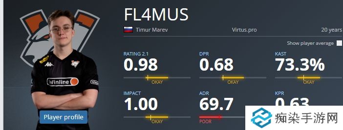 目前,FL4MUS在效力Virtus.pro以来的平均rating为0.98,ADR 69.7,数据如下: