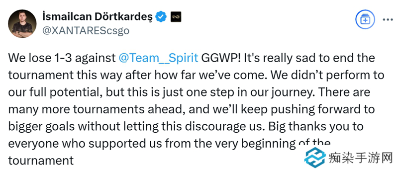 “我们以1 - 3输给了Spirit战队。一路走到如今这一步,以这样的方式结束本次赛事,实在令人难过。我们没能完全发挥出潜力,但这只是我们征程中的一小步。前方还有许多赛事,我们不会因此气馁,会继续朝着更高目标奋进。非常感谢从赛事一开始就支持我们的每一个人。 ”