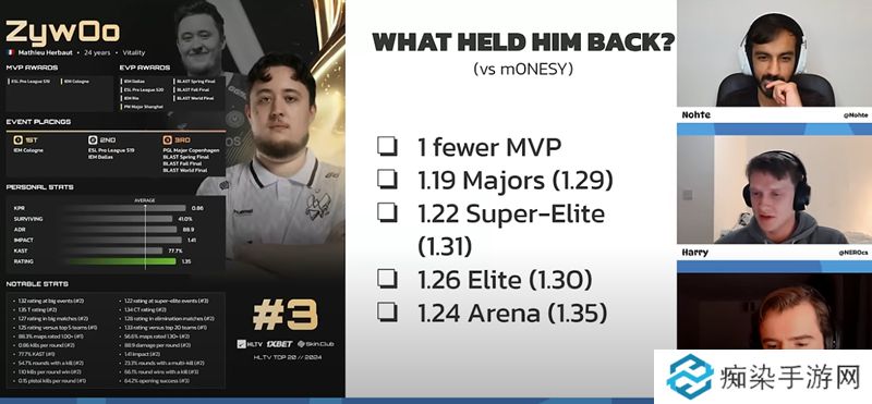 NER0在节目中直言,ZywOo的全年数据无疑是顶尖的——高击杀率、高伤害量、关键局面发挥等各项指标都表现优秀。但是,HLTV的排名体系更倾向于看重选手在重大赛事中的表现,而这恰恰是ZywOo的短板之一。