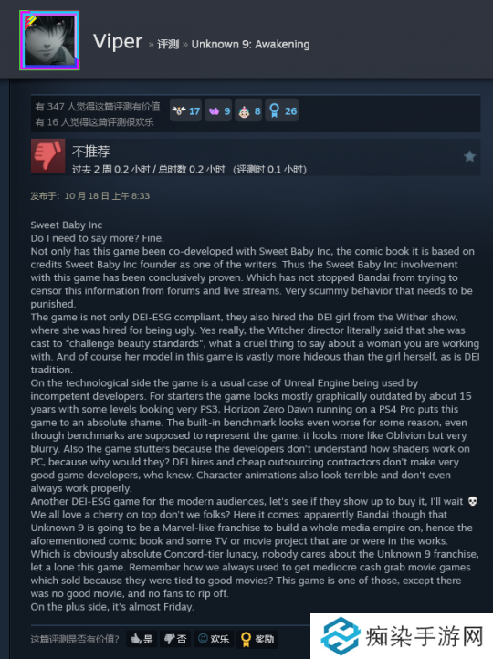 然而不容忽视的是,这款游戏的“正确”要素很有可能也影响了其表现。根据玩家 Viper 指出,这款游戏也与 Sweet Baby Inc. 有着紧密的联系:首先游戏是与 SBI 合作开发的,其次这部游戏改编自的原作漫画的作者之一是 SBI 的创始人。