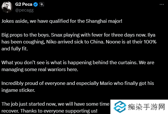 Spirit后晋级Major,G2战队经理Peca发文恭喜战队晋级,并称赞队员们是真正的战士。