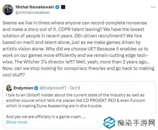 之前有传言称CDPR已陷入困境,因为关注DEI和失去高级人才。最近CDPR对该传言予以否认,CDPR联合首席执行官Michal Nowakowski发推文称这是无稽之谈,请停止阴谋论。