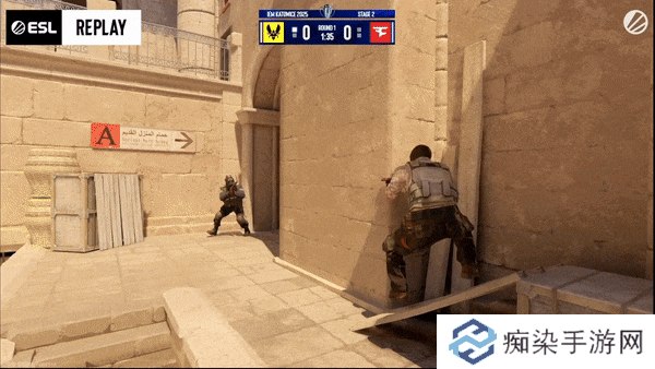 Vitality先做进攻方。手枪局土匪炸铁门和黄房同步进攻A区,放下雷包以后形成交叉枪线,Vitality拿下手枪局。