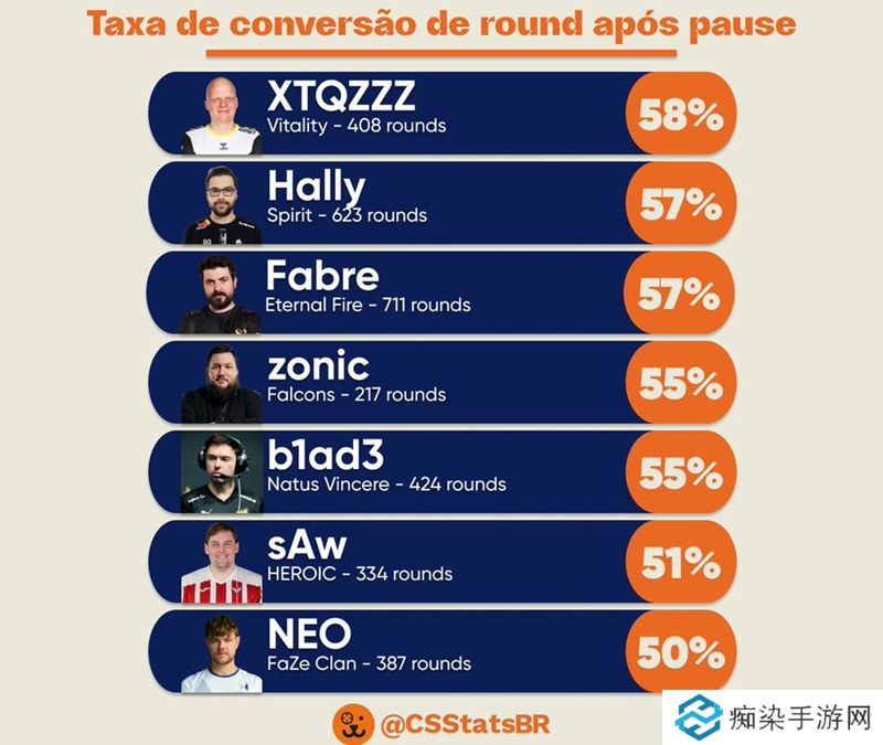 CS Stats BR发布的另一项调查,是关于常规获胜回合数与暂停后获胜回合数的对比研究。例如