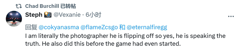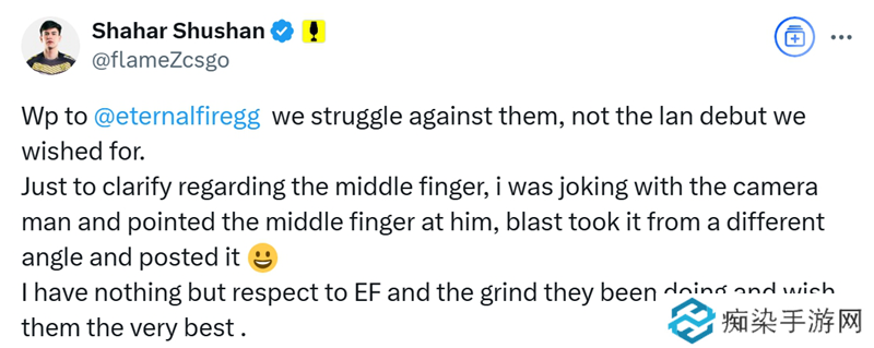 我想解释一下竖中指这件事。我是在和摄影师开玩笑,对他做了这个手势。BLAST在直播中从另一个角度截取了画面并展示出来。我尊重Eternal Fire战队以及他们的努力。祝他们一切顺利。”