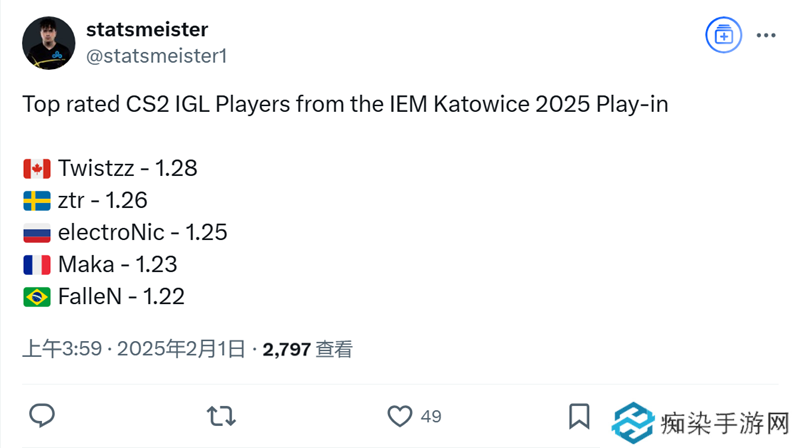 GamerLegion战队之后正努力找回曾经的自己,第三名是土耳其选手woxic。而第九名是Twistzz,成为指挥并没有过多影响他的火力输出。