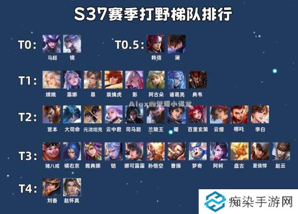 T1梯队:嫦娥、露娜、暃、裴擒虎、典韦(中低分段T0)、影、阿古朵、诸葛亮
