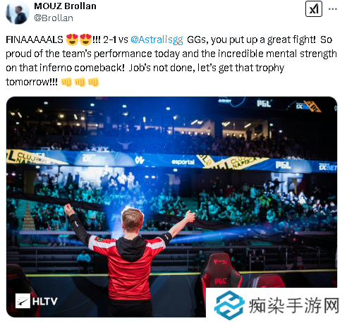 Brollan:决赛来了!!!以2-1战胜Astralis GGs,感谢你们呈现的精彩表现!我为团队今天的表现感到无比自豪,尤其是在那场Inferno翻盘的比赛中展现出的优秀心理素质!任务还未完成,明天让我们争夺那座奖杯!!!