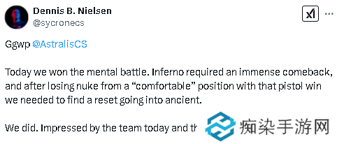 xertioN:真是一场精彩的比赛,我为我们的表现感到自豪,GGWP Astralis,你们今天带给了我们一场激烈的较量!我直到最后一张地图才发挥出最佳状态,能够为我的队友们挺身而出我感到很高兴,Spinx的表现令人惊叹,而Brollan的指挥让我们在Inferno上逆转了局势。