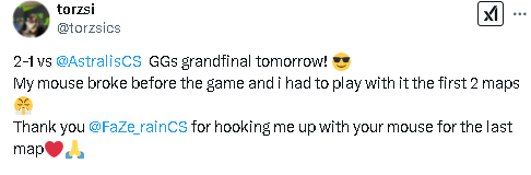 torzsi:2-1战胜Astralis,明天总决赛!在比赛前我的鼠标坏了,我不得不在前两张地图上用它来打。感谢rain在最后一张地图上把鼠标借给我。