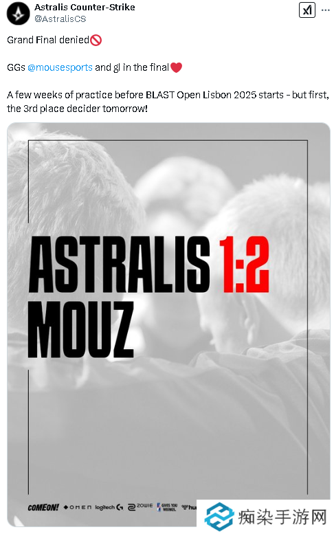 Astralis官推:被总决赛拒之门外。GGs MOUZ,祝你们在决赛中好运。