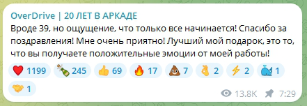 OverDrive在个人频道上表达了对粉丝们的感谢:“看起来是39岁,但我感觉这只是一个开始!感谢大家的祝福!我非常高兴!对我来说最好的礼物就是看到你们从我的工作中获得积极的情绪!”