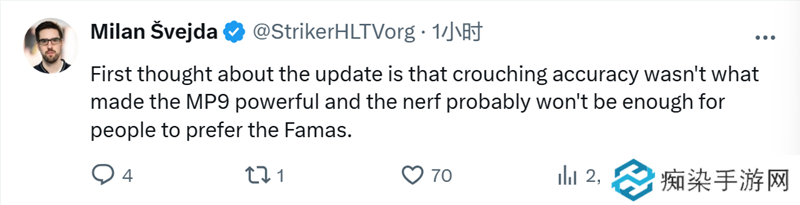Striker:对于这次更新,我的第一反应是,蹲下射击精度并非MP9强大的原因,而且这次削弱可能还不足以让人们更喜欢法玛斯。