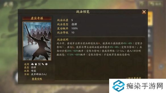 ①第一段效果【按兵种】给予不同状态:咱们一般默认为S兵种,8%发动率提升,效果参考荀攸受智力加成后可达到13%左右。这段效果最大利好激活主动战法类的大C位(如:SP关羽、庞统、张角、黄忠)。如果主将是A兵种适性,那相当于省了一个宝物,但浪费了加主动发动率,没必要。同时注意,这个状态增益效果是八回合全程有效!