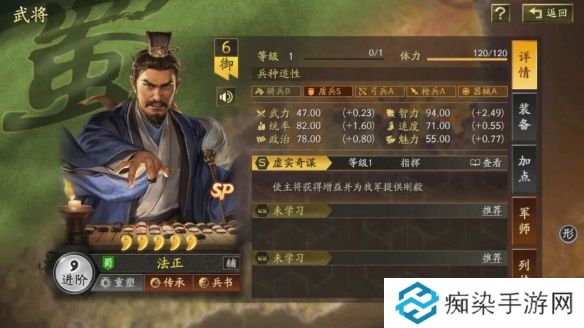 SP法正面板中的智统成长相较于老法正有了明显提升,具备了一个核心辅助的面板属性基础,兵种适性保持不变。