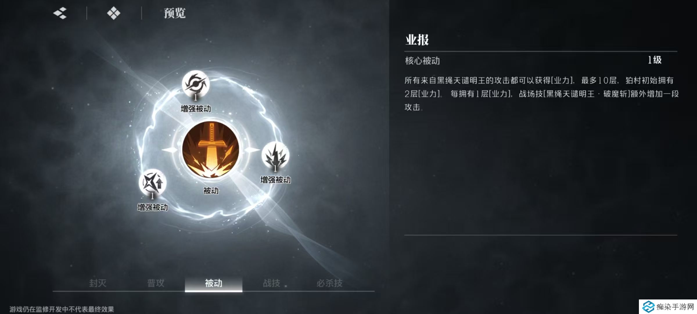 柏村左阵的核心被动业报,所有来自黑绳天谴明王的攻击都可以获得业力,最多叠加十层,最初狛村左阵有两层,每拥有一层,战场技额外增加一段攻击。在增强被动的影响下,狛村左阵护盾生效期间,拥有该护盾的角色暴击率提升,战场技每次造成伤害时都会使目标打系抗性降低,狛村左阵护盾的最大伤害吸收量提升。