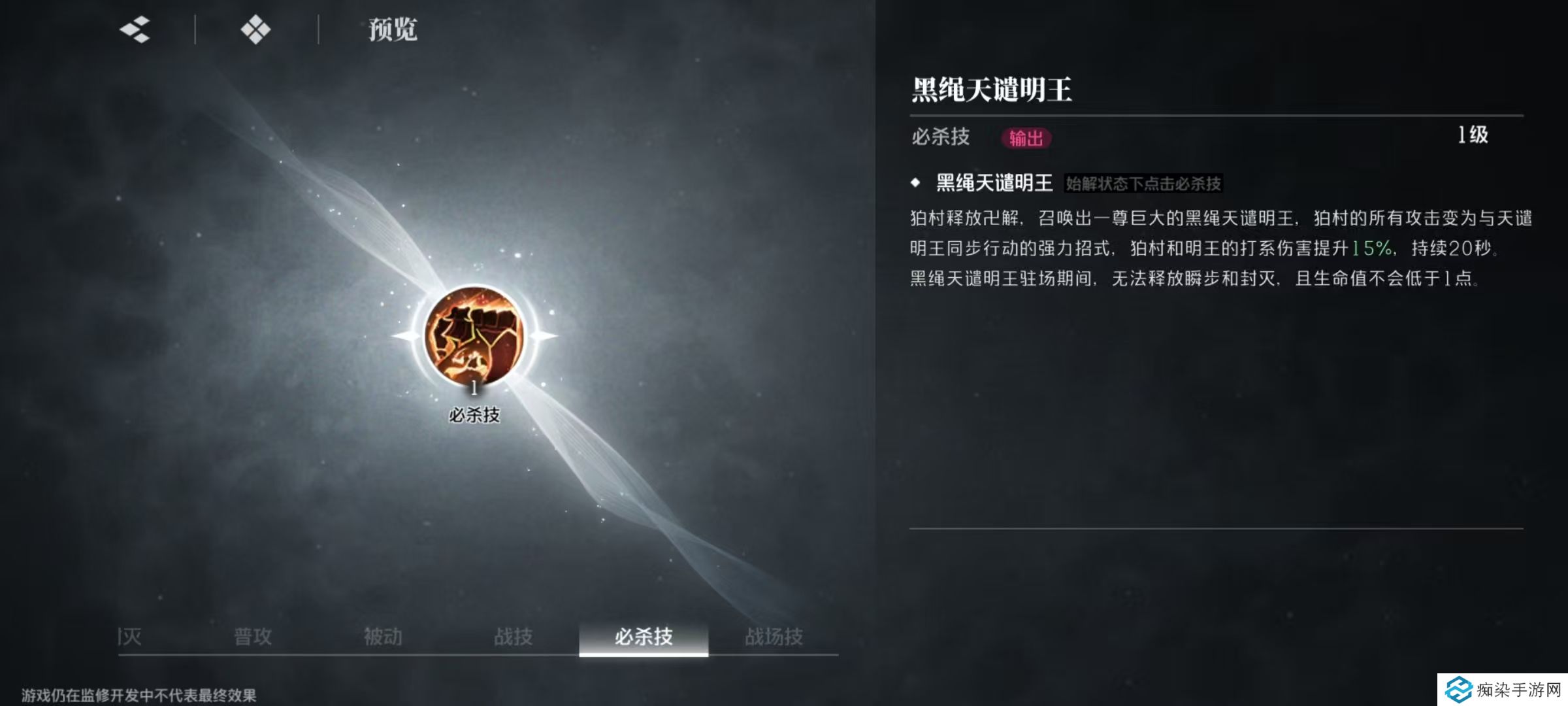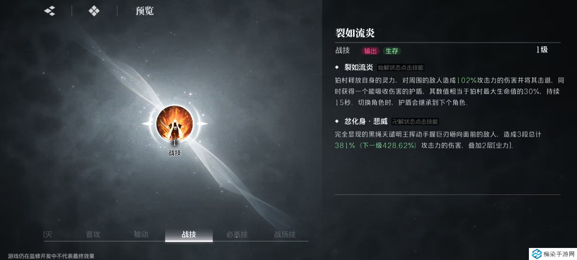 还有一个战场技,当战场技激活时,所有角色打系伤害提升30%。在除自身以外其他角色释放战技或者是普攻最后一段时就可以激活,协同天谴明王挥刀劈砍,对目标造成范围伤害并叠加业力。在始解状态下可以直接点击战场,即切换狛村左阵上场,对目标造成范围伤害并叠加业力。