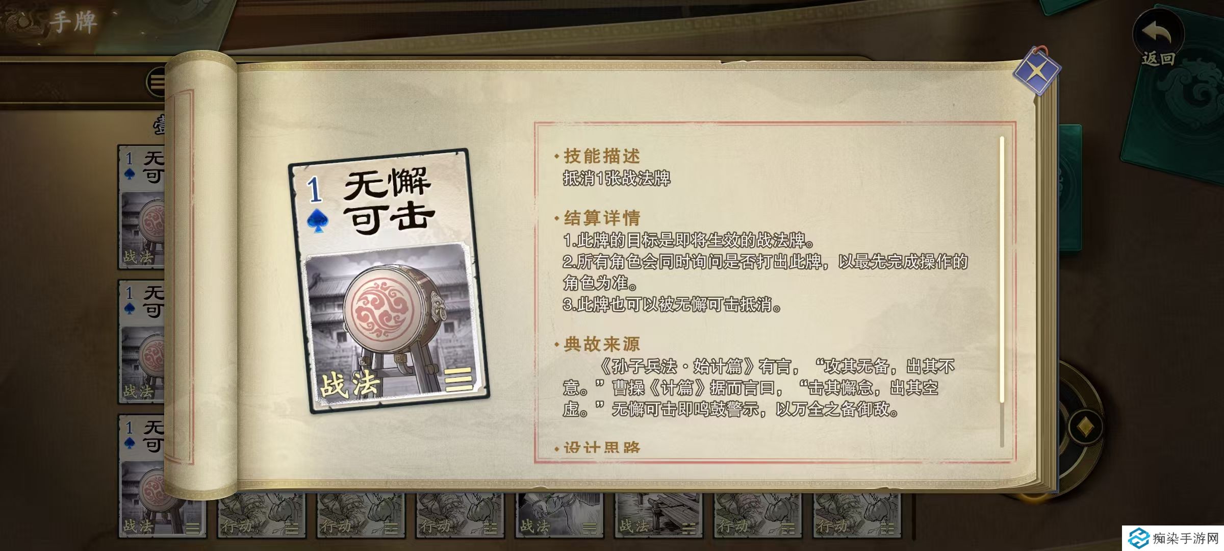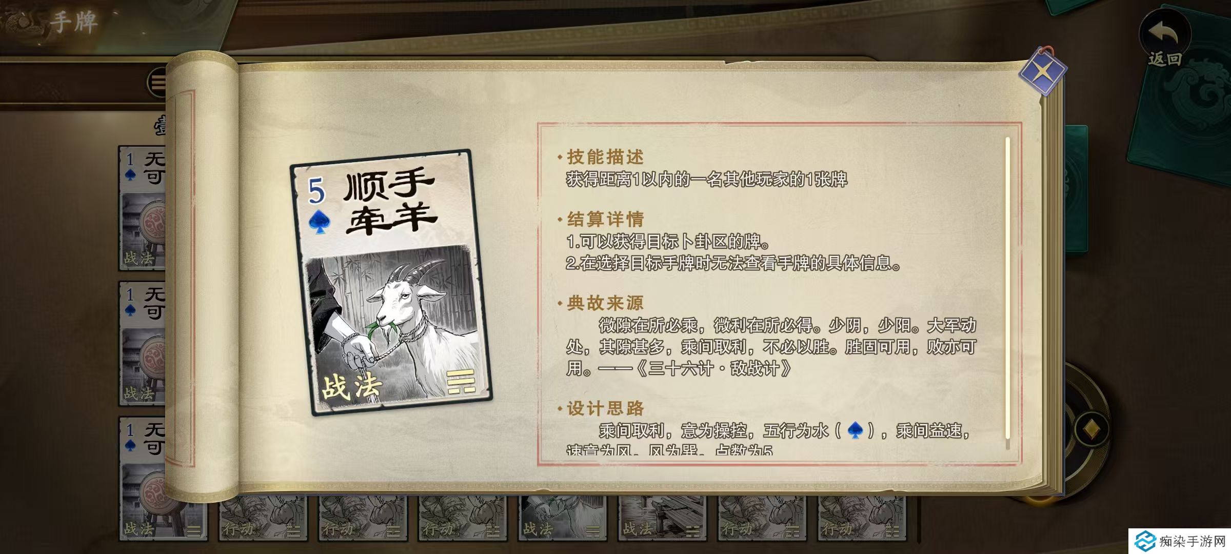 第4个先拔头筹,翻开存活玩家数量的牌,选择获得一张,然后其他玩家依次获得一张,一般来说首次选择还是很有优势的,可以拿到自己最需要的牌。使用的时候尽量结合自身当前的位置,让队友也可以享受到优势。第5个无懈可击,可以抵消一张战法牌,无论是给自己使用、队友使用、对手使用都可以。看清阵营和效果。第6个顺手牵羊,选择距离一格以内的其他玩家获得其一张手牌使用也比较广泛,可以偷对手的牌,也可以给队友使用,达到其他效果。