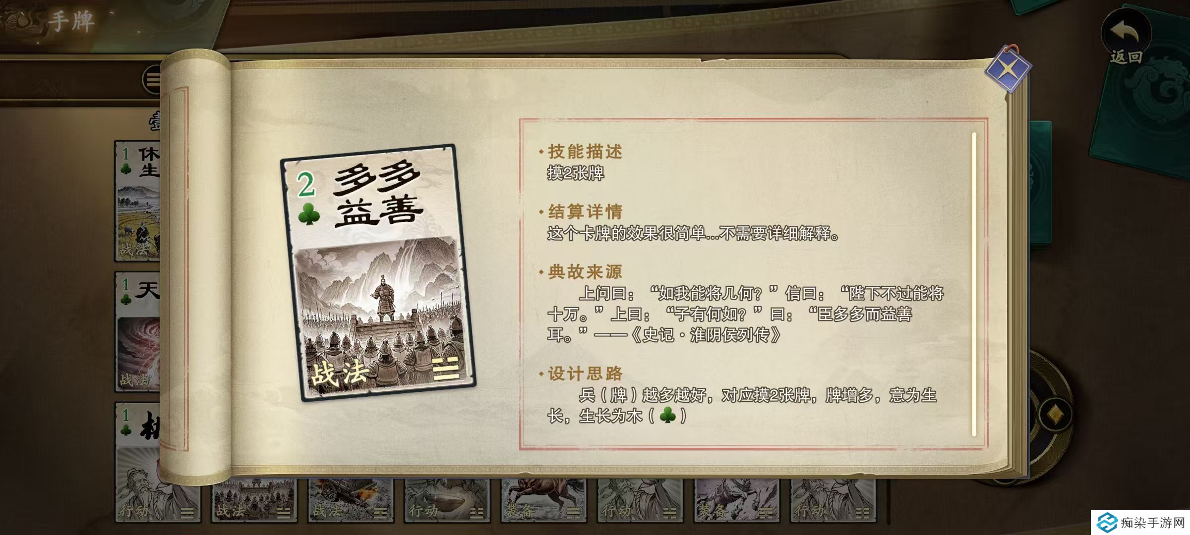 第1个烈火焚城,需要弃置一张手牌或装备牌,然后另一名有手牌的角色弃置相同属性的手牌,如果对方没有,会随机焚毁对方一张牌,然后造成一点火焰伤害。这张牌有一定的**性质,如果对方手牌比较少,还是有较大的几率打出伤害的。第2个烽火狼烟,打出之后所有角色都需要打出杀,否则受到一点伤害。Aoe技能,使用的时候要慎重,不要误伤到队友。第3个多多益善,使用之后直接摸两张牌,虽然非常美好,但是小心被对方的无懈可击所阻挡。