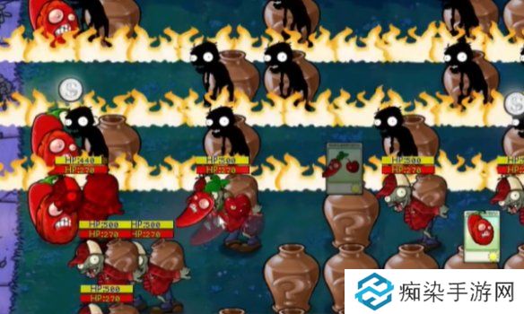3、然后将出现的辣椒樱桃放在僵尸就能消灭三行的僵尸。