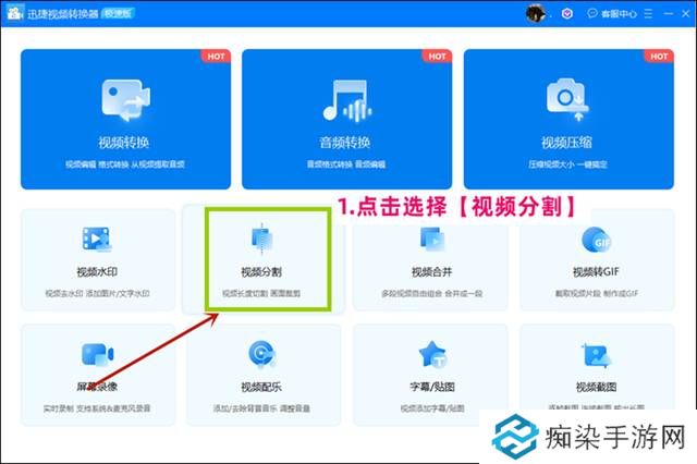 步骤一 首先打开电脑桌面的【迅捷视频转换器】,进入首页后,我们可以看到有许多功能选项,找到【视频分割】的功能,点击选择。