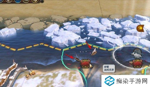 2.将建造者移动到海边,即可看到可以建立渔船的推荐位置了。将建造者移动到有螃蟹图标的单元格内(每个地图不同,不一定都是螃蟹)。