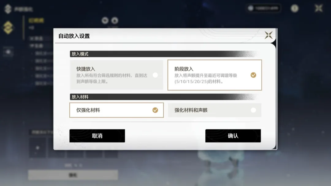 最后,声骸素材之后的强化体验也得到了进一步的优化。强化声骸时将可以自动【阶段放入】强化素材,来强化至最近的可调谐等级(5/10/15/20/25),声骸强化体验将更加高效。