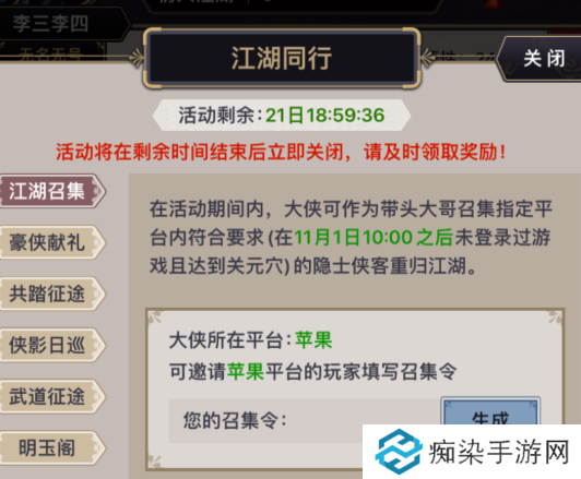 这就是江湖中江湖同行是一个以召集旧友、共同闯荡江湖为主题的限时活动,玩家们生成召集令后就能够领取奖励,接下来小编就为大家带来具体的玩法介绍,感兴趣的一起来看看吧。