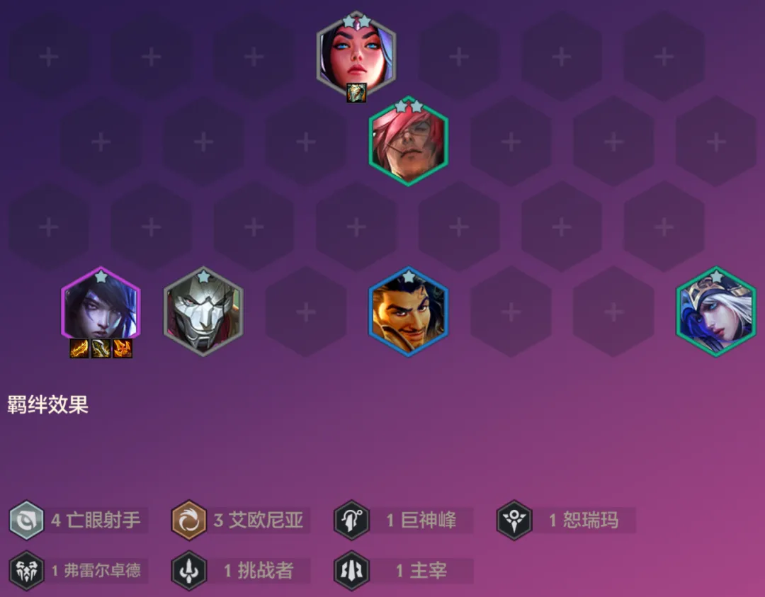 厄斐琉斯开局也是有连胜的能力的,前期可以搭配亡眼,艾欧过渡,也可以搭配堡垒或格斗家过渡。