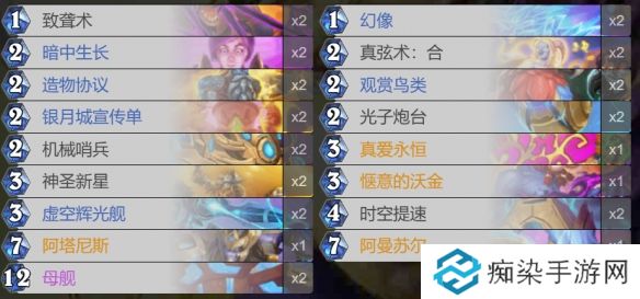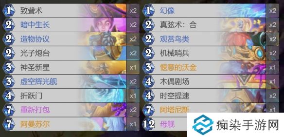 构筑在此基础上加入了一些低费优质随从和星轨晕环来保证前期节奏,夜影花茶、光子炮台、炽热火炭和混调师提供的药水是卡组的主要解场/补伤害手段,重新打包和阿曼苏尔能处理大哥德和虫DK棘手的场面。