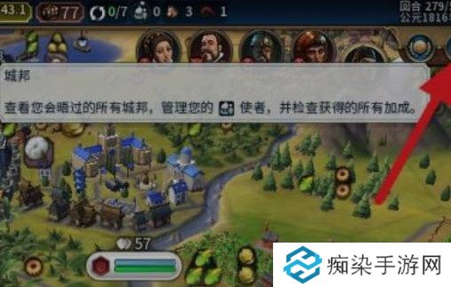 1.在文明6游戏里面,我们先点击右上角的城邦按钮。