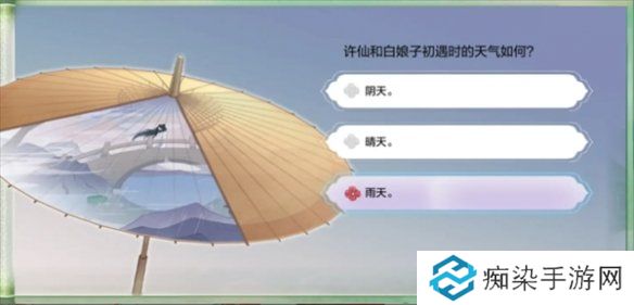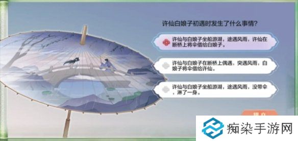 答:许仙与白娘子坐船游湖,途遇风雨,许仙在断桥上将伞借给白娘子。
