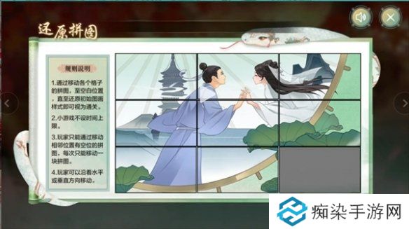 3、玩家只能遇过移动相邻位置有空位的拼图,每次只能移动一块拼图。
